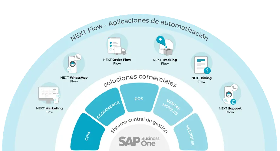 En NextPro implementamos CRM, Ecommerce, Toma pedidos móvil, POS y Helpdesk integrados a SAP, creando un entorno comercial totalmente conectado.